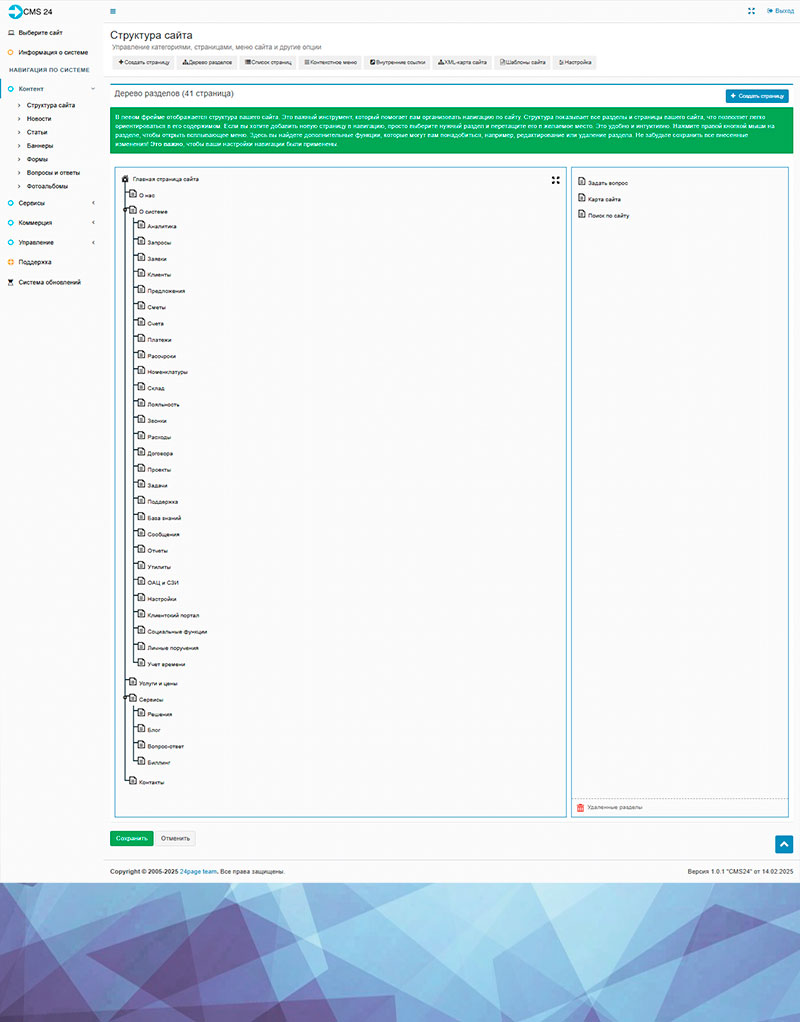 - Структура сайта: Древовидная интуитивно понятная структура для легкого управления страницами.