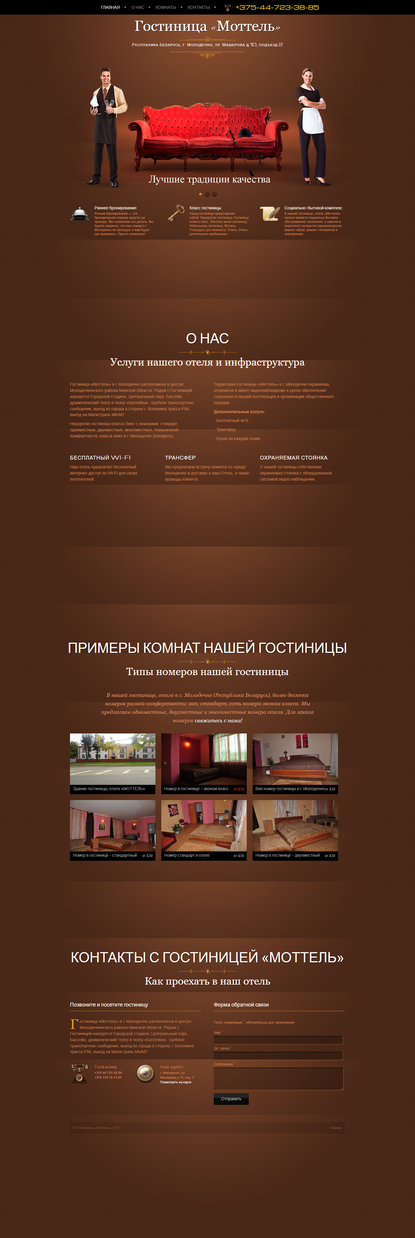 - Контакты: Информация о способах связи с гостиницей.